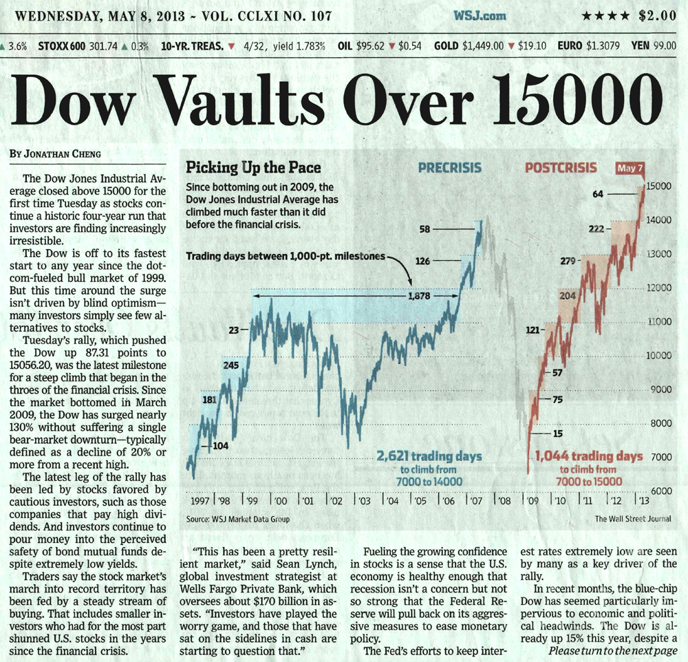 The ‘crisis’ in the Dow Jones pre-crisis and post-crisis the the Wall Street Journal refers to in its front page article about the DJIA reaching 15,000 for the first time on Tuesday, is the Lehman Brothers/ World Financial/ Great Recession crisis of 2008, of course. But there are other crises that have certainly not played themselves out fully – such as the European debt crisis, the repeated US debt-ceiling wrangles in Congress and the US unemployment crisis. And the USA is still awash in cheap money with the Federal funds rate sitting at zero almost 5 years after 2008.