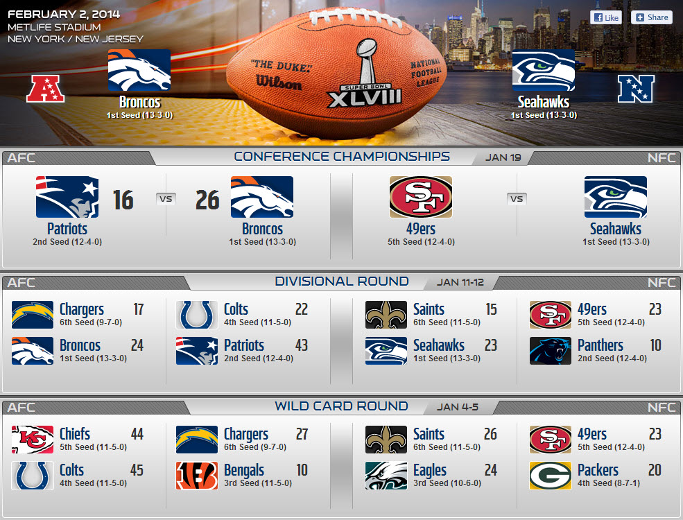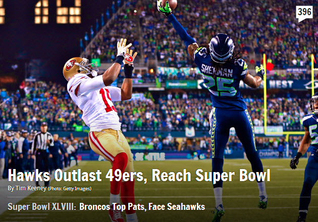 The Seahawks will take on the Broncos on Feb 2 in the Superbowl. The Seahawks came out with a 23-17 victory over the San Francisco 49ers today. The Hawks were down 3-10 at halftime, and the game had a somewhat dramatic ending in the final minutes when a touchdown throw from 49ers QB Colin Kaepernick’s to teammate Malcolm Smith was intercepted by Richard Sherman. So my hometown team will take on my ‘work town’ team!