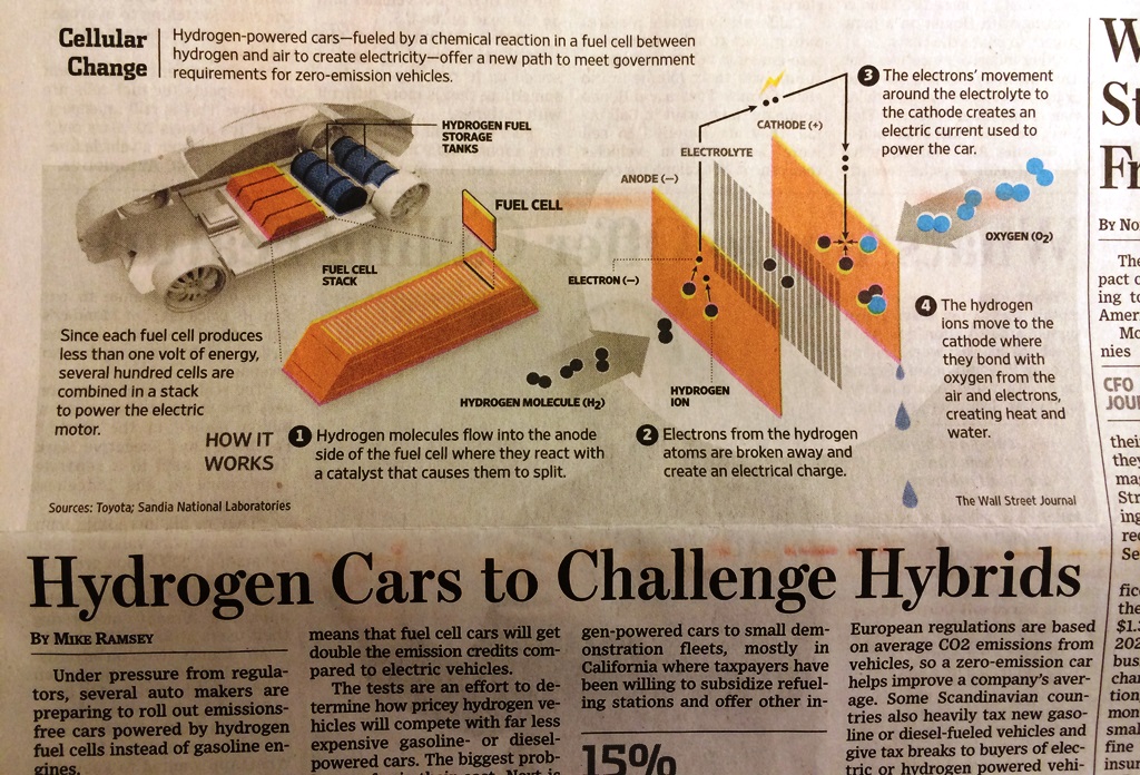 An article in the Wall Street Journal of Tuesday about hydrogen fuel cell cars caught my eye. The article notes that interest in this technology seem to wax and wane with government and state regulations that are issued, and with the fortunes of car companies.