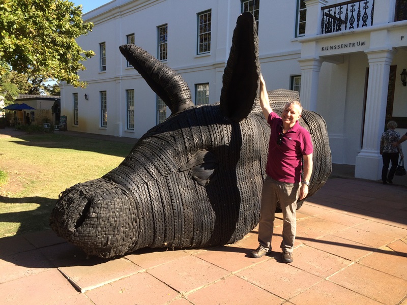 We ran more errands in Stellenbosch today, and took a minute to stop by this outdoor artwork to take a picture. Dawn Jorgensen’s blog has more pictures here that shows the wonderful detail that was created with the ‘medium’ of black rubber tyres (tires).