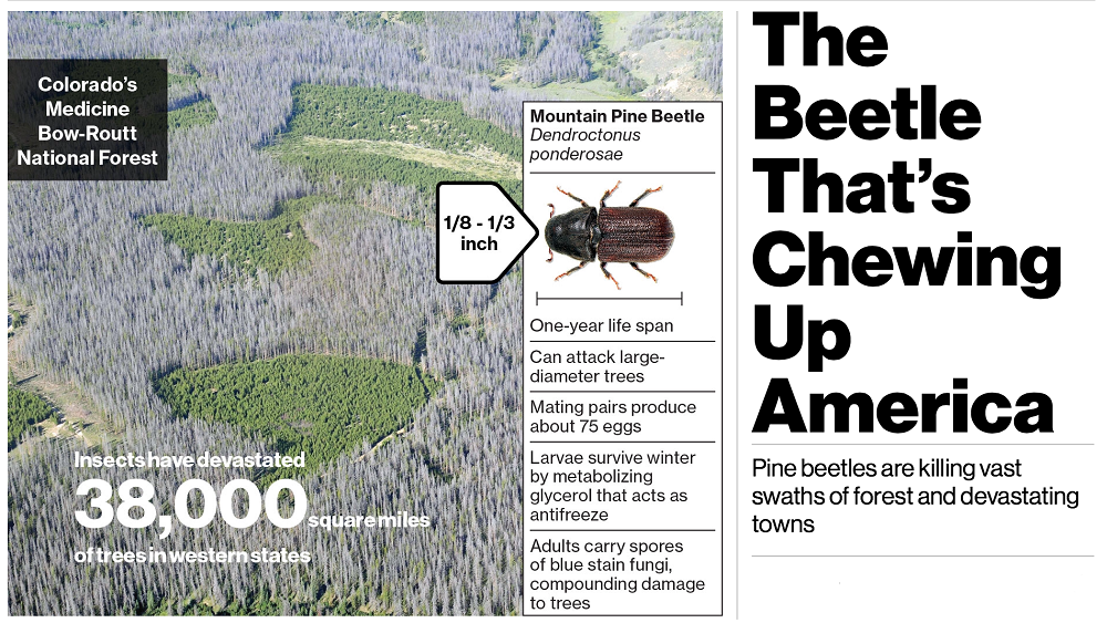 I read about the problems that national parks in the western states here in the USA are having with mountain pine beetle infestations : it’s scary. Mountain pine beetles attack several types of pine tree, including ponderosa pine, lodgepole pine, limber pine, bristlecone pine, Scotch pine and Austrian pine. Beetles seek out the oldest trees, preferring ones over 80 years old. Thousands of years of instincts help the pine beetle locate the oldest, most stressed trees. In the natural cycle, pine beetles are important factors in helping to maintain the health of a forest .. but this surely is too much of a good thing at work!