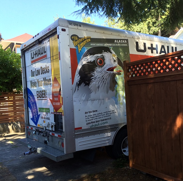 I have new neighbors moving in, and so this U-haul Venture-across-America #116 truck with the striking picture of a goshawk from Alaska’s Tongass National Forest was parked in the alley this morning. The iconic white-and-orange trucks for do-it-themselves movers can be seen anywhere in the country. I love the gorgeous graphics that they put on the sides of the trucks. The whole collection can be seen on U-haul’s website, here.
