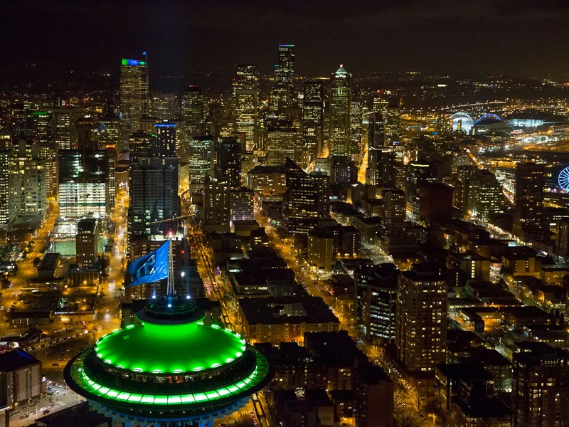 Here’s a bird’s eye view* of the city of Seattle, looking south with the ’12th man’ (Seahawks football team supporter) flag atop the Space Needle. Other tall buildings sport the blue and green colors of the team as well. The action on Sunday at 12 noon is in the stadium at the top right of the picture, where the Seahawks play against the Greenbay Packers for a spot in the Superbowl.