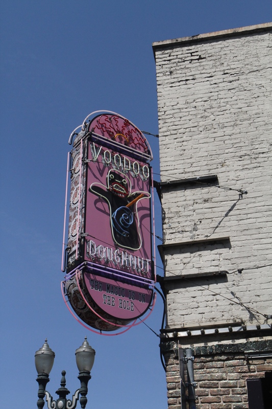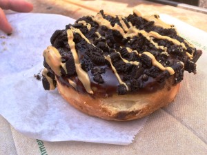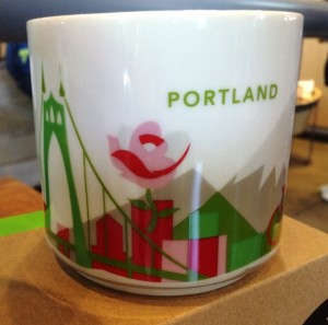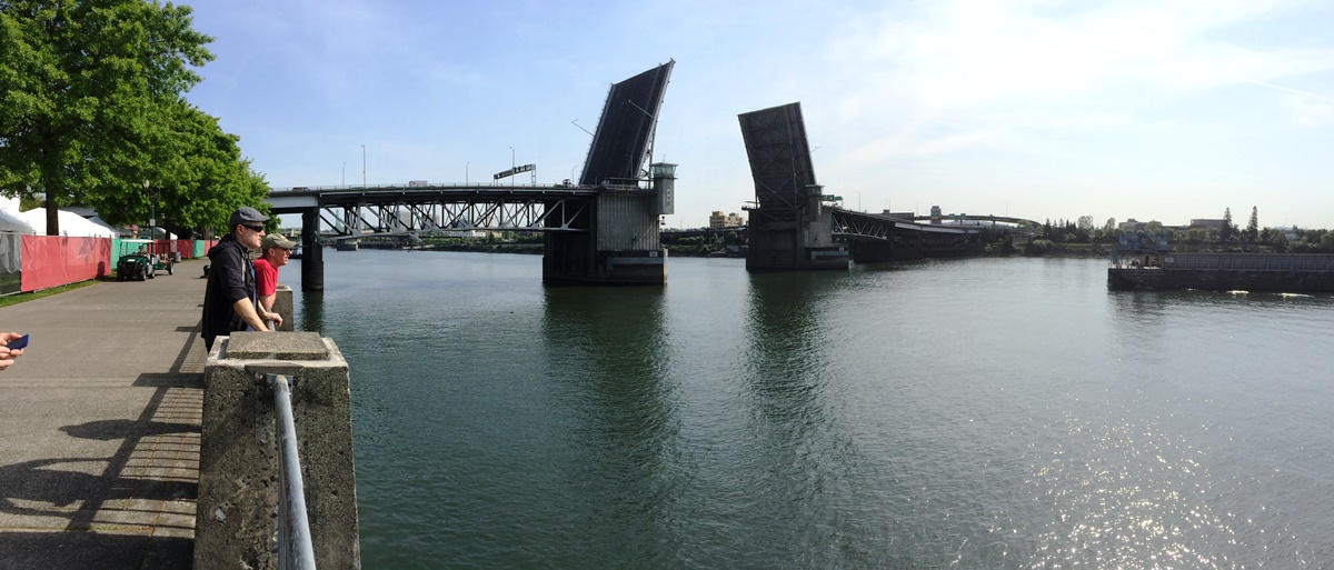 We’re on the banks of the Willamette river, and just in time to see the drawbridge open up for a barge that needs to pass through underneath.Here is a street car that stopped at a plaza close to the University of Portland. I could not fit the street car in one frame and so I clicked three times instead !Here is Starbucks’s mug for the city of Portland, also called the City of Roses.This was our lunch spot, called Huber’s. It is billed as the city’s oldest restaurant, some 178 years old. Check out the cool lead and glass skylights.This is the famous Voodoo Doughnut Store. Most mornings the line of patrons stretches around the corner.This offering from Voodoo Doughnut has chocolate, crushed Oreo cookie and caramel on.We found this happy group of Portland dancers in one of the plazas in the city. They look Polish or East Euopean to me, but the sign just called them ‘The Portland dancers’.This is the chalkboard from Powell’s bookstore. (It is a very large and unique bookstore. If it ever closes, civilization as we know it will have come to an end).Friday was May 1, International Workers’ Day,and this small group made a go of it to protest working conditions, wages and the USA’s immigration policies. There was no serious confrontations or violence. (Not so in Seattle, where cars were damages and protesters and police were injured).