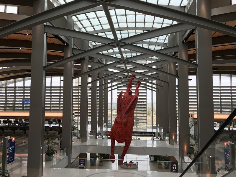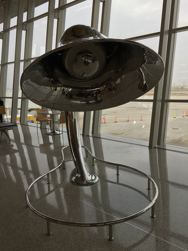 Here are some pictures of my arrival at Sacramento airport. The airport is not nearly as big as San Francisco International or the sprawling LAX (Los Angeles) airport, but I the Terminal B where I had arrived is practically brand-spanking new (it opened in 2011). The $1 billion terminal contains $6 million of public art. Its construction created some 2,400 jobs over 2 1/2 years during a recession that had left state and regional unemployment hovering around 12 percent.