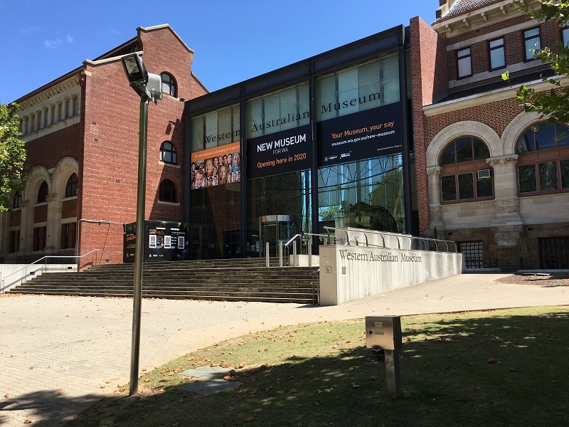 Our north-bound train is arriving at Bullcreek Station, on the way tp Perth downtown.The Queen’s Building on Murray Street is right by the downtown train station exit. It was constructed just before 1900.This is the Perth General Post Office building in the central business district. Construction commenced in 1914, and was finally completed in 1923. This is the precise location where distances from Perth are measured on maps and road signs.This is still downtown. We’re making our way to the Western Australia Museum and the cultural center. I still have to go and check out the modern buildings visible at the far end of this street (one is a cobalt blue).The Western Australia Museum is getting an expansion and renovation, with the ‘new’ museum slated to open in 2020.Time for a ‘selfie’ in a reflecting metal outdoor work of art outside the museum.A view of the Swan River on the train ride back (it forms a lake of sorts before it reaches the ocean). For nearly 40,000 years the area on which Perth now stands was occupied by groups of the Nyoongar people and their ancestors; this had been verified by the discovery of ancient stone implements near the Swan River which have been carbon dated at 38,000 years old. In December, 1696, three ships in the fleet commanded by de Vlamingh anchored off Rottnest Island and on 5th January, 1697, a well-armed party landed near the present-day Cottesloe Beach, marching eastward to the Swan River near Freshwater Bay. They tried to contact some of the Nyoongar to enquire about the fate of survivors of the Ridderschap van Hollant, lost in 1694, but were unsuccessful. Following this encounter, they sailed north, but not before de Vlamingh had bestowed the name Swan on the river because of the black swans he saw swimming there. Just over 100 years later, in 1829, Captain James Stirling founded Perth as part of the Swan River Colony.