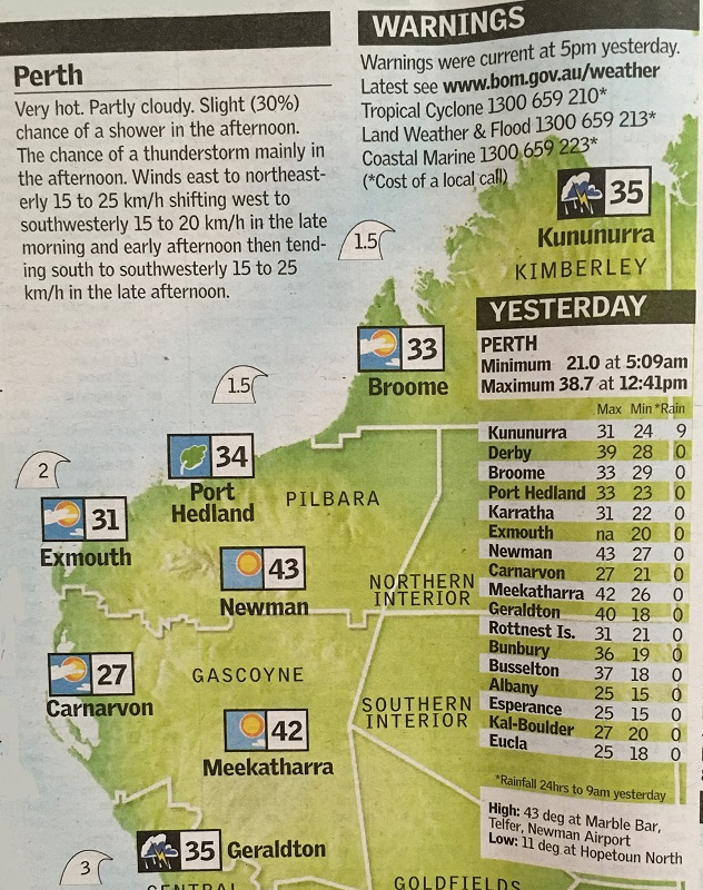 It was still very warm on Wednesday (that 39 for Perth is Celsius and equals 100 °F !).
