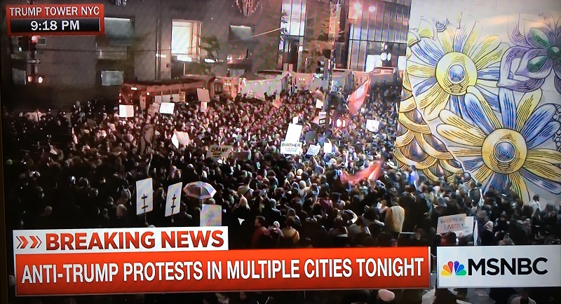 The number of passengers on the short bus ride in to the office here in San Francisco, and on the train back to the hotel today was noticeably smaller than usual. Maybe office workers stayed up into the wee hours the way I did and only made it in later! I kept my head down today, working as if it was a normal day. Tonight, spontaneous protests have sprung up in several cities .. peaceful so far. I spotted protesters with #DumpTrump and ‘Stop White Supremacy’ signs (dumping Trump is not going to happen people!; and besides all those red states voting for Trump, we can blame white women voters; turned out they voted for Trump and not for Hillary). The results for lots of other ballot initiatives are starting to roll in. Minimum wage increase initiatives across the country are 4 for 4 Approved; California voted to make marijuana legal as well, joining Washington State and Colorado. Looks like Seattle and its surrounding counties have also given the Yes vote to raising funds to build 62 more miles of light rail.