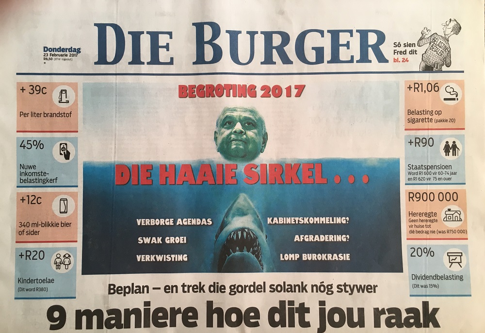 South African Minister of Finance Pravin Gordhan presented his budget for 2017 for South Africa in parliament on Wednesday. He had to make some tough calls, but the budget was generally well-received and seen as balanced. A new super-tax rate will kick in at a rate of 45% for earners with income of above R1.5 million (about US$113,000). Value Added Tax for goods and services is kept the same at 14% (the country’s labor unions vowed nationwide protests if that rate was raised). Gas will become even more expensive (currently at the equivalent of about $4/ gallon), and all the vices – cigarettes, cigars and alcohol products – will be taxed more heavily as well.