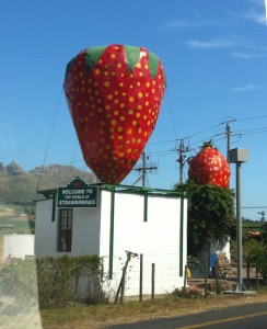 One cannot miss the giant strawberries from the Mooiberge Farm Stall on the way from Stellenbosch to The Strand on the R44 road. They are in season here, and tourists can wander through the fields and pick them on Saturdays and Sundays, and pay by the kilogram. I hope they go and check now and again if there’s still some left! Meanwhile, CNN reported just today about strawberry plants in the southern town of Qaqoortoq in Greenland. With the warming of the climate there, they are being tested there to see whether they will survive the harsh winter, and they seem to survive so far. So quite possibly the Greenlanders will have strawberries of their own !
