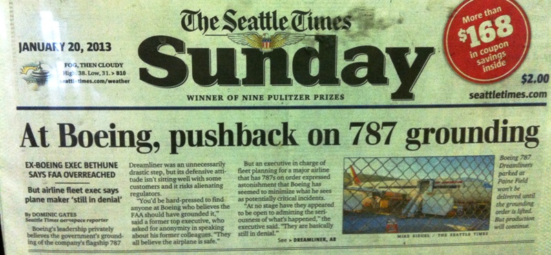 The FAA’s grounding of all 787’s continues to be in the news. Boeing has stopped delivering new planes to customers but (for now) is continuing with their manufacture. It’s cheaper to continue doing that and putting the fixes (coming out of the investigation) with the lithium batteries in later. About FIVE a month is built – and the machines go for about $200 million each.