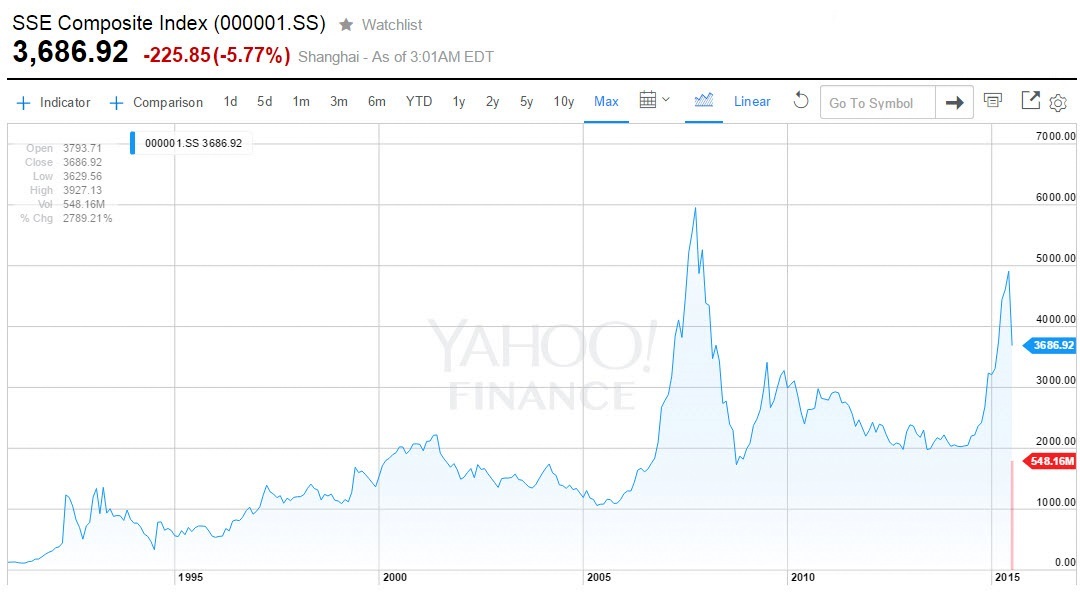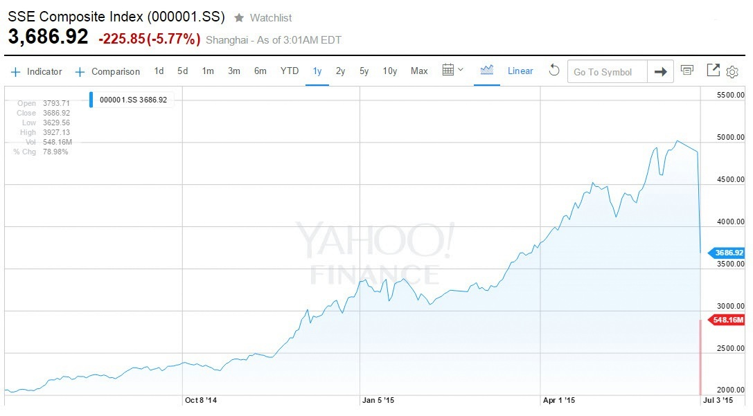 Check out these charts of the Shanghai Stock Exchange’s composite index. As of the end of the day Friday in China, the index is down 27% from its June 12 peak, wiping out some $2.4 trillion of value. Individual investors* account for about 80 percent of trading on mainland Chinese exchanges.