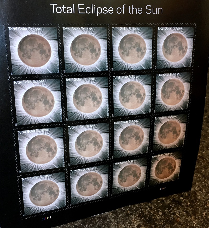 The Total Eclipse of the Sun ‘forever’* stamps that I ordered, arrived today. I promptly put my fat finger on one to see if the thermochromic ink works as advertised. It does, and the image of the moon reverts back to a ‘total eclipse’ (black blob) soon after one removes the source of heat.