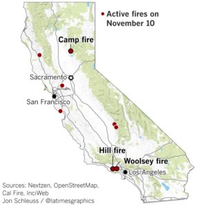 Further south, the Woolsey Fire has scorched 70,000 acres (130 sq mi), and forced 250,000 people to evacuate in the Malibu area.