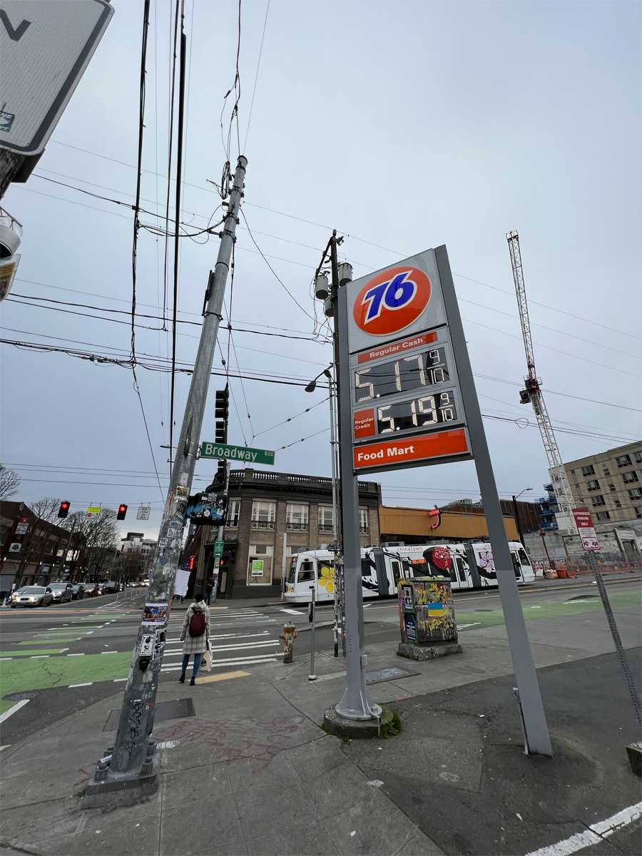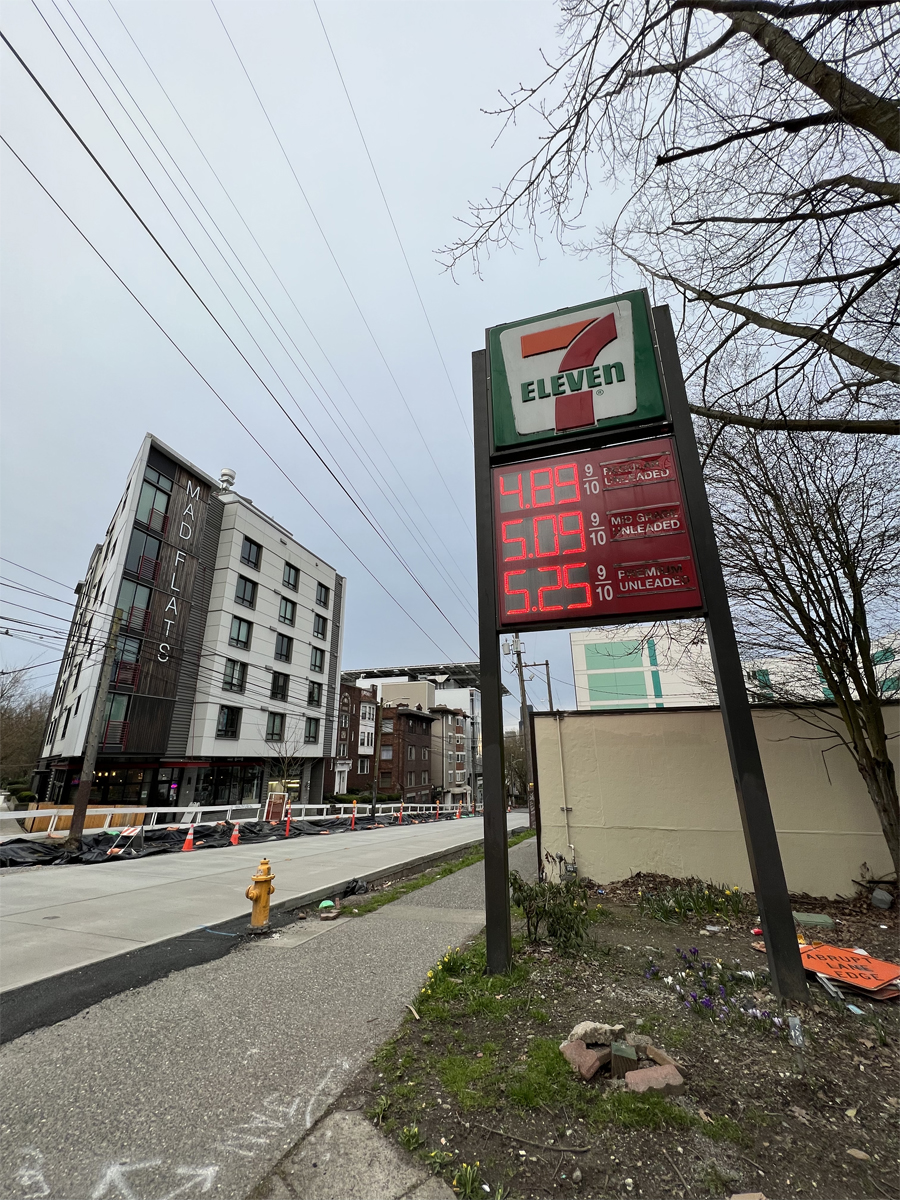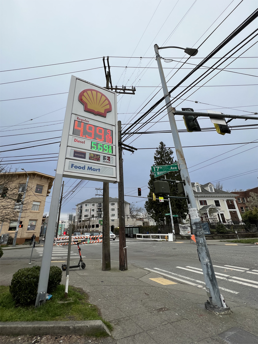 Seattle is about a dollar a gallon above the national average, but a dollar or more below California’s prices.