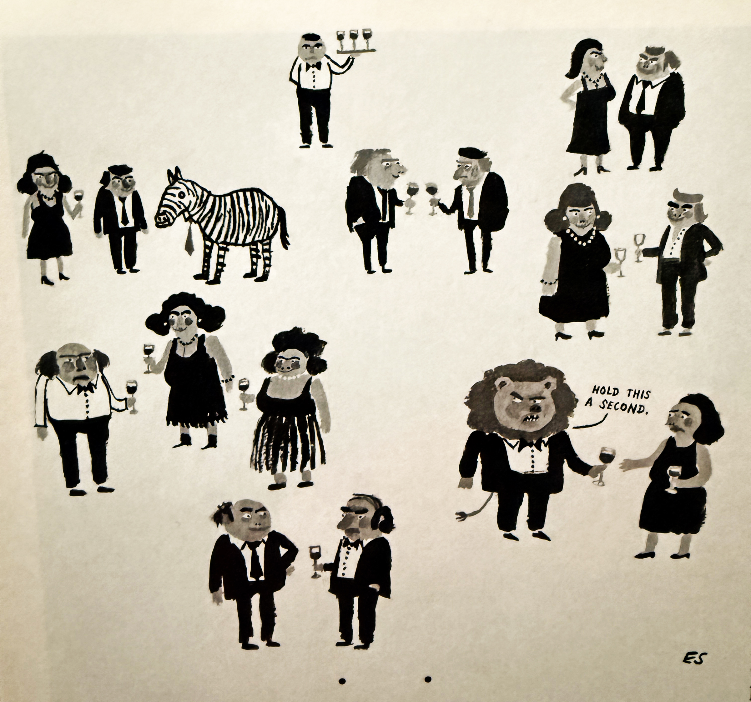 Here is the explainer from Chat GPT: The humor comes from the contrast: ‘Polite cocktail-party etiquette’ versus ‘Wild-animal behavior’. It’s the absurd mix of manners (“Could you hold my drink?”) with the expectation that something ferocious is about to happen (such as the lion devouring the zebra). The rest of the party acting like all this is totally normal adds to the surreal deadpan comedy. [From The New Yorker magazine, the Dec 18 & 25, 2017 issue].