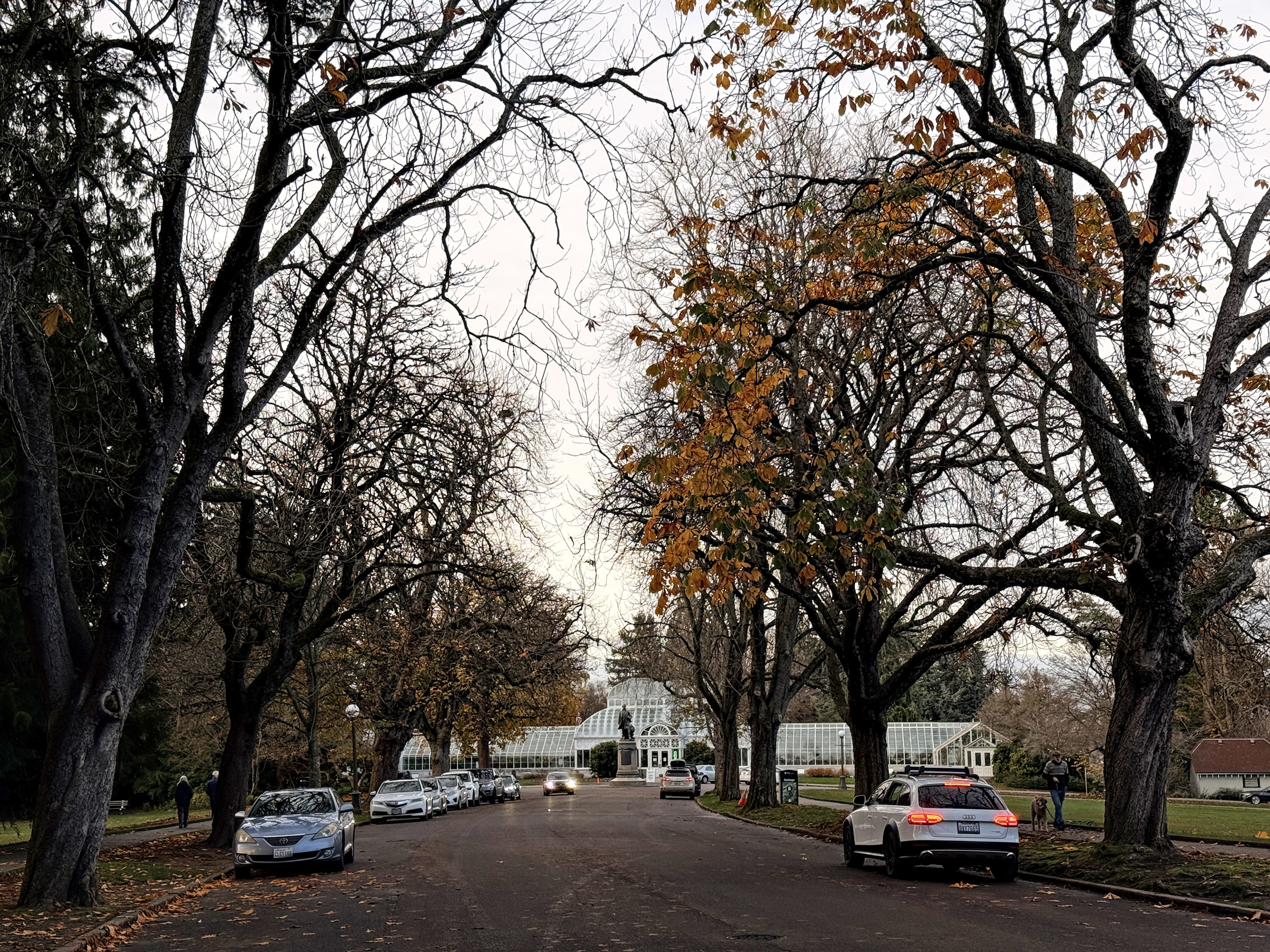 The trees that lead to the Volunteer Park Conservatory are now mostly bare of their leaves.