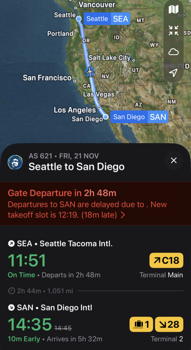 Screenshot from my Flighty app warning that we will have an on-time departure (pushback from the gate), but that there will be an 18 min delay in taking off (which was exactly what happened, but we still arrived 10 mins early);