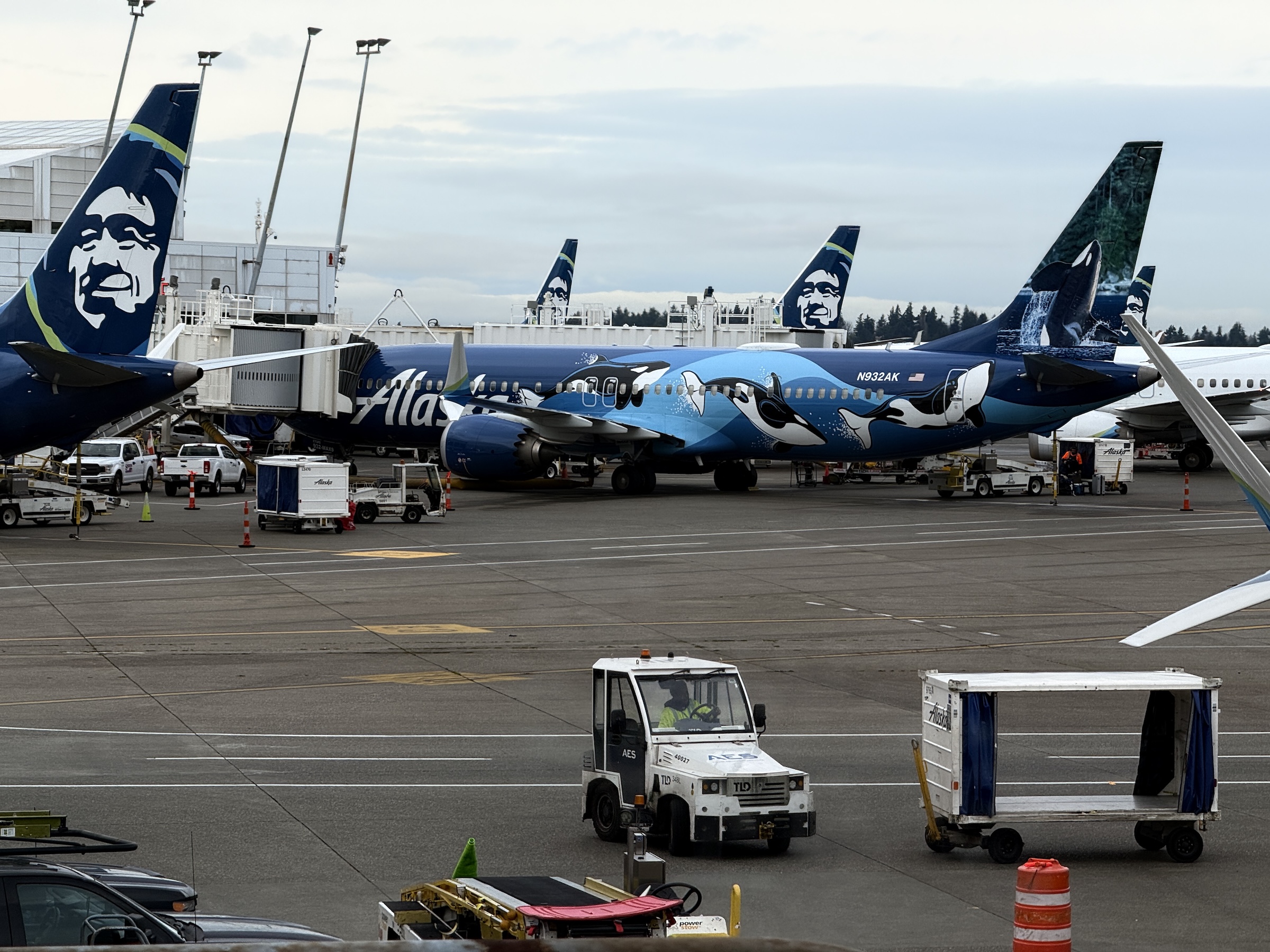 Alaska Airlines Boeing 737 MAX 9 with orca livery at Seattle-Tacoma airport;