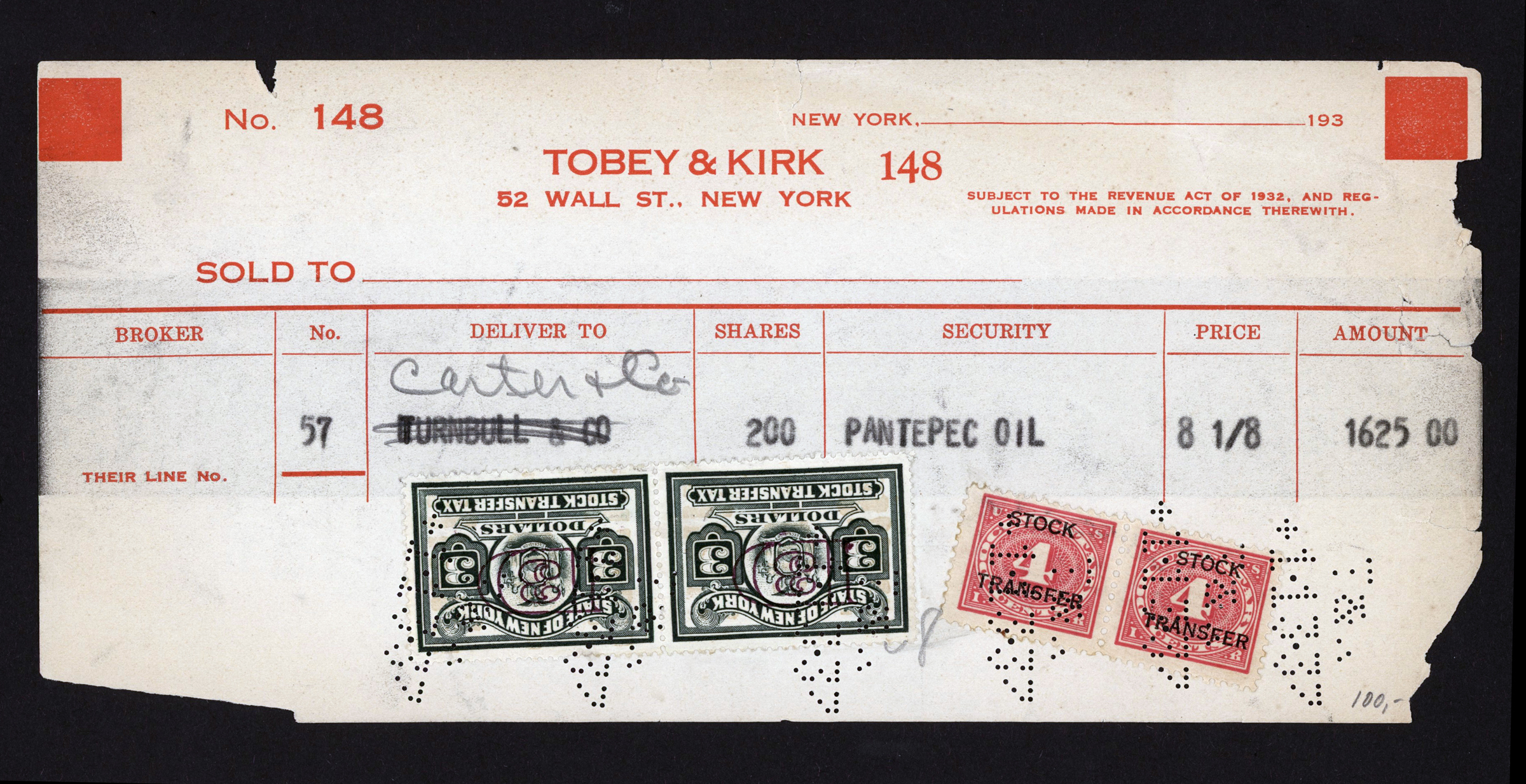 Here’s what I have found out so far: Tobey & Kirk was a prominent stockbroker firm located at 52 Wall Street, in New York’s financial district. Pantepec Oil Company was an oil company founded by William F. Buckley Sr. in 1913, with operations primarily in Mexico and Venezuela. This transaction show the sale of 200 Pantepec Oil shares for $8.125 for a total amount of $1,625. The stock transfer tax stamps on the paper slip were first issued in 1936. If I read the perfin (pin hole) cancellation on the stamps correctly, they indicate a transaction date of 1.13.37 (Jan. 13, 1937). In 1937, the United States had a federal stock transfer tax in effect, which had been significantly increased in 1932 as part of the government’s response to the Great Depression. The red stamps (2x 4c) are for federal stock transfer taxes. I suspect there were more federal stock transfer tax stamps on the slip that are now missing. (The federal transfer tax was typically roughly equal to the New York State transfer tax at the time. ) The green stamps (2 x $3.00) are the NY State stock transfer tax stamps.