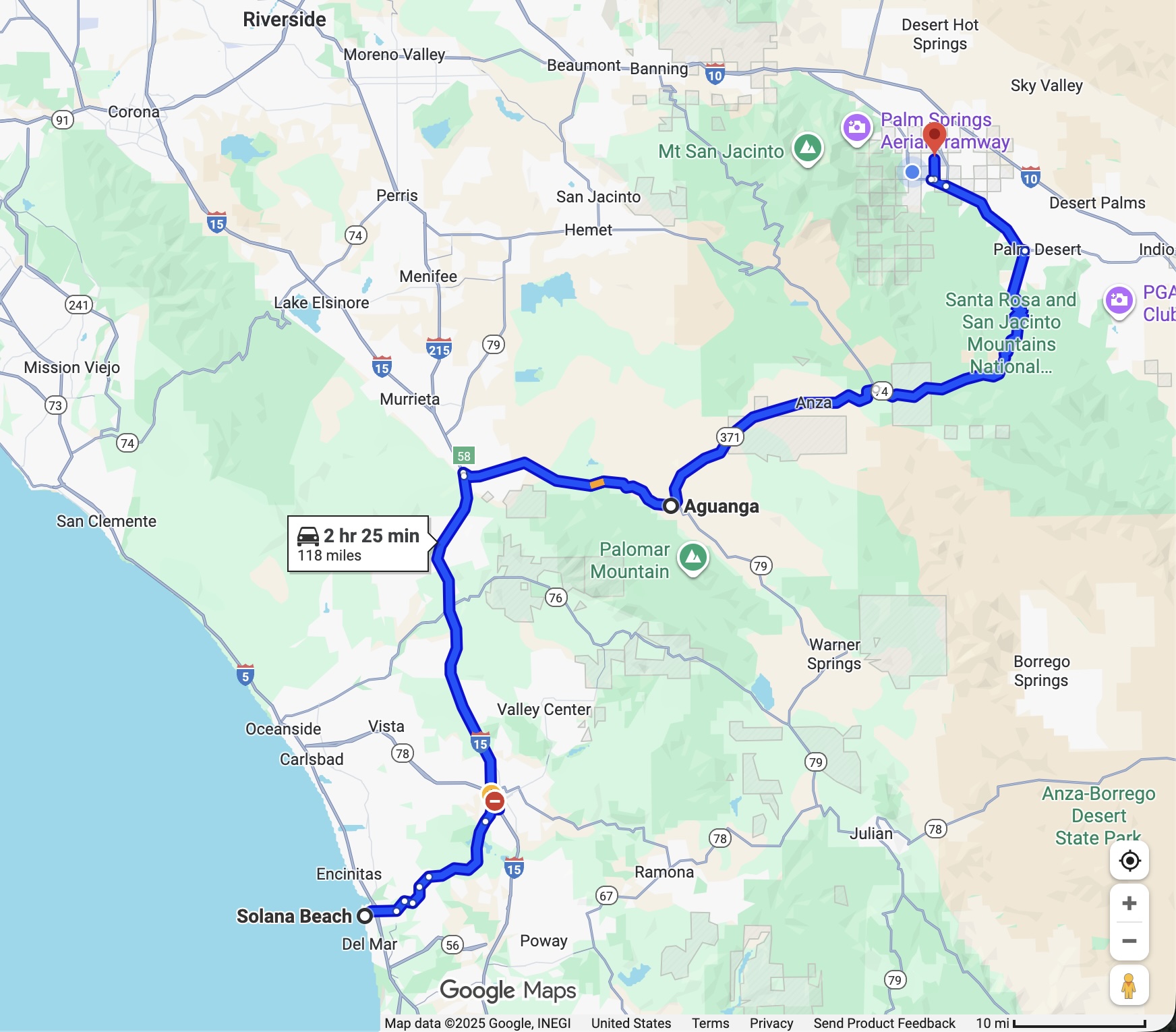 I took the scenic route from Solana Beach to Palm Springs today, driving across the Santa Rosa and San Jacinto mountains.