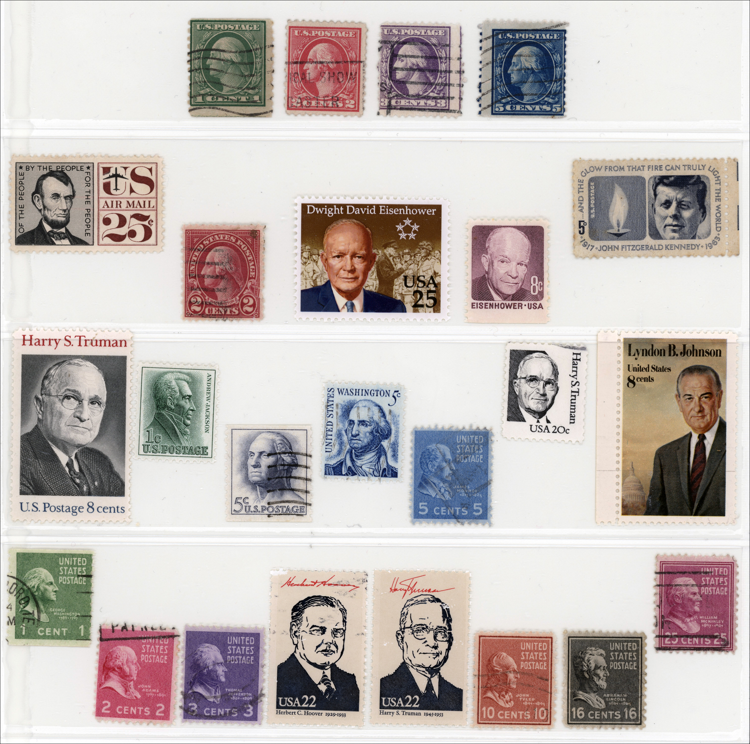 This ensemble of US presidents on postage stamps issued by the U.S. Postal Service is from my modest collection of US stamps.