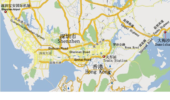 To get from the red dot at Dameisha on the far right where the apartments are, to the ‘Train Station’ dot on the Hong Kong border with a taxi driver, should go without a hitch.