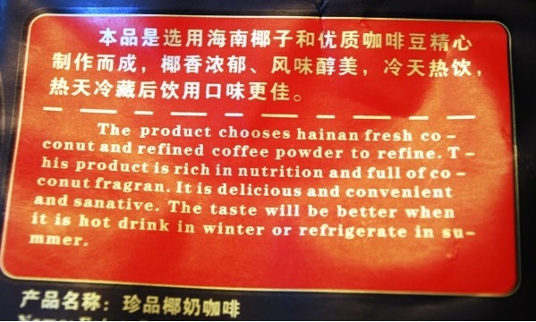 Here’s the cute translation into English, from the back of the coconut coffee bag. (Would have posted it yesterday, but had to wait until I got home so that I could take a high-resolution picture). Note the creative breaks in the words T-his (wow) and su-mmer, and – the taste will be better when it is hot drink in winter. Gotcha! :).