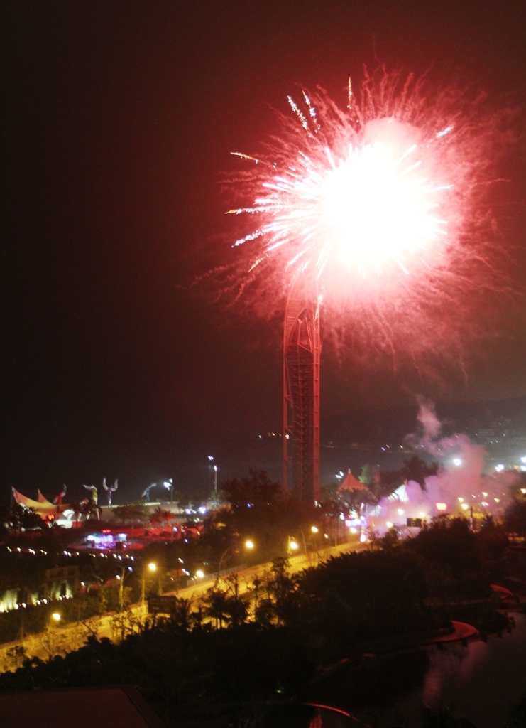 The Yantian Sports Center is from my walk around 8.00pm last night, so it is here in Dameisha. The big exploding firecracker is one of two or three dozen, viewed from my hotel balcony at 10.00 pm last night. It makes a <<<REALLY BIG BANG>>> ! Take coverrr! LOL. That’s the Dameisha Beach ‘Evil Eye’ Tower in the background. (The tower is not evil – it just reminds me of that tower with the eye in the Lord of the Rings movies).