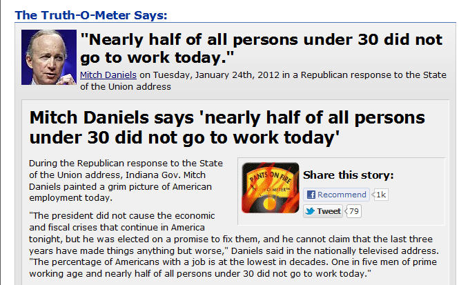 What about Indiana governor Mitch Daniels’s statement in his rebuttal to the SOTU speech ‘Nearly half of all persons under 30 did not go to work today’? That rates as a Pants-on-Fire statement, making a ridiculous claim.
