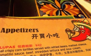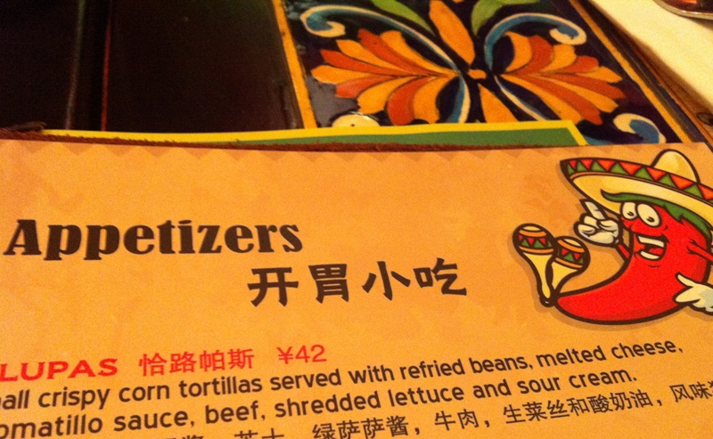Friday night found nine gringos (foreigners) upstairs at the Tequila Coyote Cantina., a Mexican restaurant in the Futian district in Shenzhen. There was even a page with Tex-Mex items on the menu. After some translation difficulty for our request for a pitcher* of margarita cocktail mix, the restaurant improvised and brought the good stuff out in a Carlsberg beer pitcher.