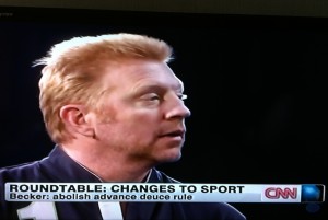 segment today of four sports champions. Tennis (Boris Becker*): Abolish deuce-advantage scoring – to make matches shorter. Golf (Gary Player) : Push back the tee by 50 yards for professionals – to accommodate newer club and golf ball technology. Athletics (Sergei Bubka) : Use radio transmitters to report time differences between runners. Soccer : Use goal-line technology – to indicate if a goal was scored or not.
