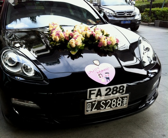 ‘Just Marry’ says the English on the hood of this Porsche wagon parked in front of the hotel where we stay. Even though Chinese weddings have been influenced by the way it is done in the West, some key differences remain. The couple registers the wedding first, and then one or more wedding banquets (xǐ-jǐu 喜酒 or ‘joyful wine’) will follow – and those are far more important than the actual wedding itself. The bride and groom also have their pictures taken days or weeks before their wedding day with glamor shots from historic sites and picturesque spots.