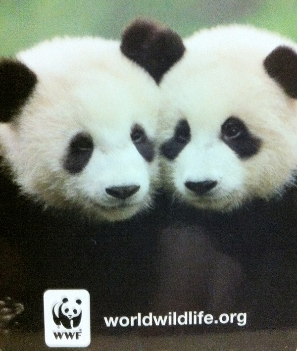 The Singha beer is from the Jamjuree restaurant where my friends and I had some wonderful Thai food Thu night. The the ‘panda burgers’ are from Wednesday night’s Jay Leno Show. The prankster offered the product to people on the street (supposedly from a small area in China where it was legal to hunt them!). The first two passers-by just said ‘Sure! I’ll take a bite‘ and ‘Pretty good!’ . Finally a young woman said ‘Are these really panda burgers?’. But she was a sport and tasted the burger as well. Aww. Leave the panda bears alone. See how cute they are on the card from the World Wildlife Fund?