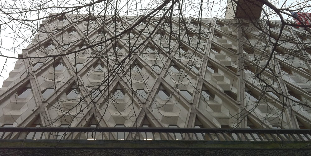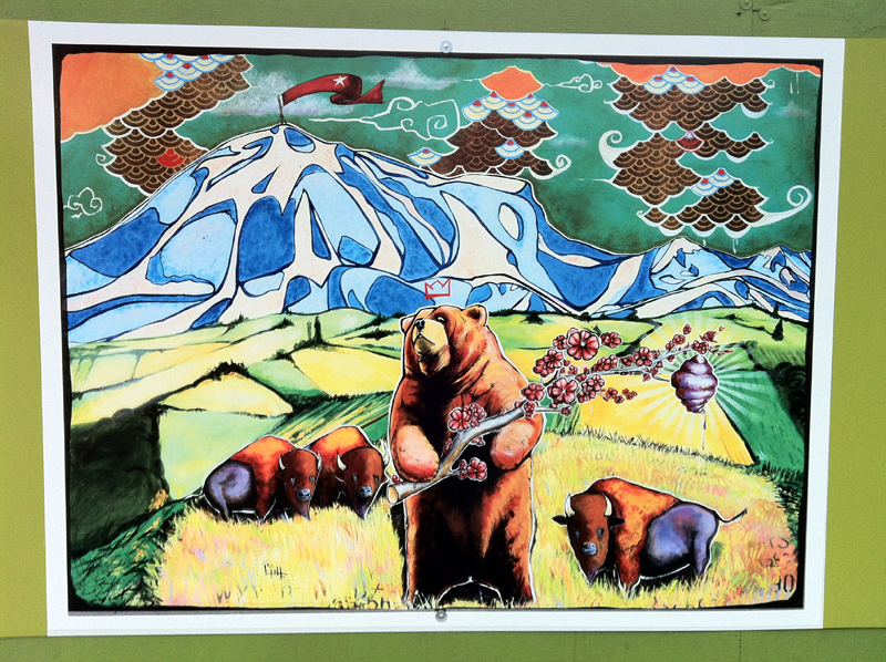 I braved the steady rain yesterday to go downtown and pay my property taxes. (I’m not putting a check for several thousand dollars in the mail!). The offices on 500 Fourth Ave have a diamond pattern on the exterior. And where does my money go? Only 17 cents on the dollar go to the county, and 50 cents to schools. Where in the country would property taxes be the highest? Westchester county in New York State. On this side of the country on the west coast it is Marin County in the San Francisco Bay area. The artwork is from a construction site close by. That must be an Ursus arctos horribilis (grizzly bear) with the American buffaloes (bison), but the curly clouds and background images are definitely Asian.