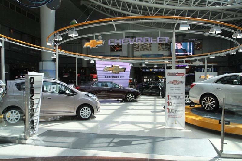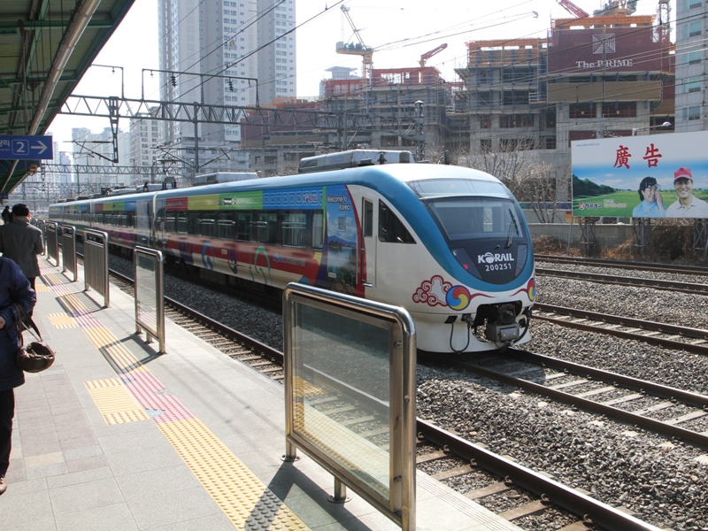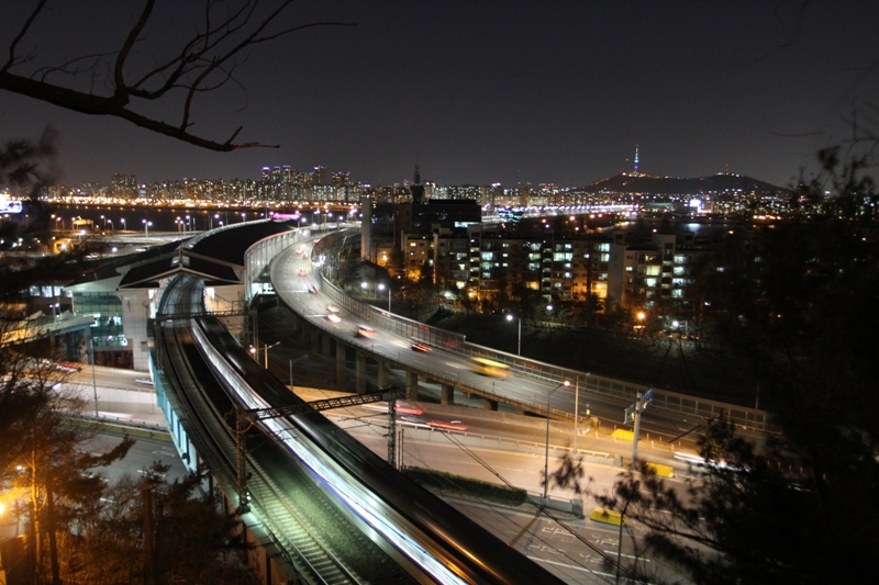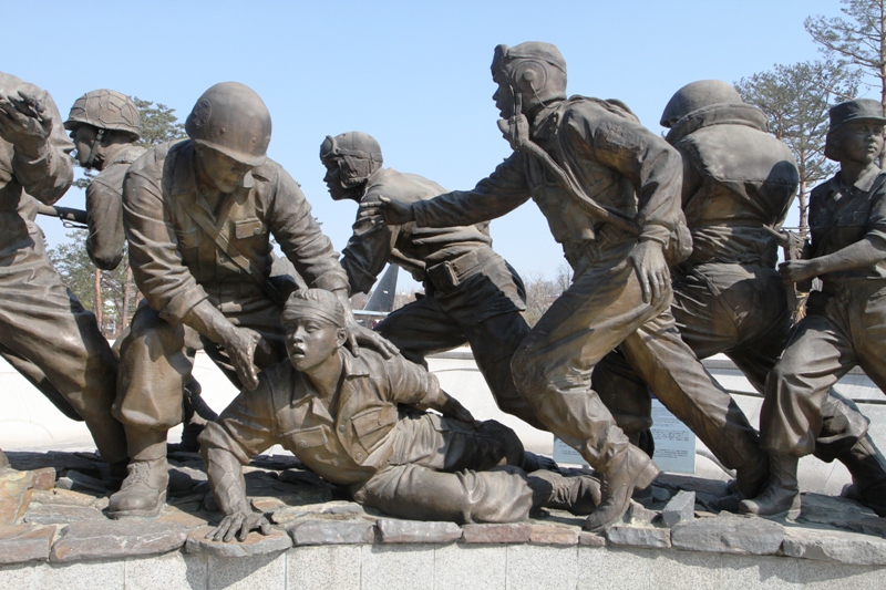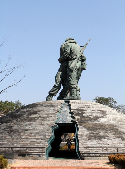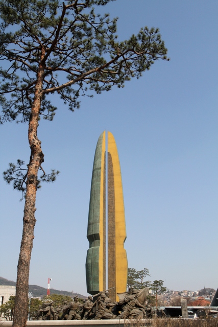 The main entrance to the War Memorial of Korea. It is a sprawling complex, with an outside area with military hardware on display as well (airplanes and boats and cannons).Yongsan station is where the electronics market is (large department stores with cubicles selling computers, cameras, phones and tablets).A peek at the plaza outside Yongsan station.Here's General Motors Korea putting its wares on display inside Yongsan train station. Some of them are Cruzes, and the little grey one on the left is a 2012 Chevrolet Sonic sub-compact.I love the colors on this suburban train.This is the 'Brothers Statue' at the War Memorial of Korea.Close by is the Korean War Monument, with bronze soldiers in action at its base.There is a lot of movement in these bronze soldiers 'in action' at the base of the Korean War Monument.The Korean War (1950-1953) is well documented inside the museum. I did not realize how perilously close to losing all of the peninsula, South Korea came. This area around what is known today as Busan port was at one point the last stand. (On 15th Sep 1950, General MacArthur landed American and South Korean marines at Inchon, 200 miles behind the North Korean lines, which was also a turning point).This is a night picture of the Rainbow Bridge at 8 pm at Dongjak station. I read on-line that at 8 pm each night, water is pumped through a series of nozzels along the edge of the bridge and colored with LED lighting. Well, I was there at 8 and NONE of that happened ! .. I will have to check into it and find out if I was at the wrong place or there at the wrong time, or both. The speck on the hilltop in the distance is Seoul Tower.