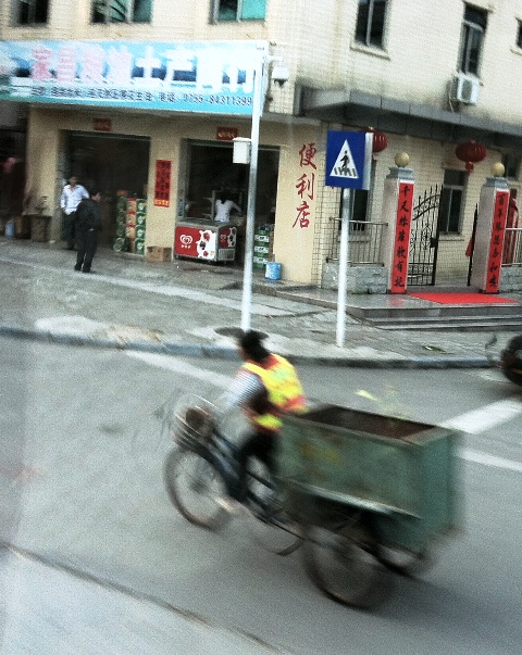 This is a street corner in Da Peng around 6.15pm from my perch on the bus back to the hotel. The weather has warmed up and is pleasant, so more people are out and about. Maybe the convenience store will sell more ice cream now (the ice box in the doorway). And the red lanterns, red carpet and red banners on the entry on the right must have been put of for the start of the Year of the Dragon, and was not taken down.