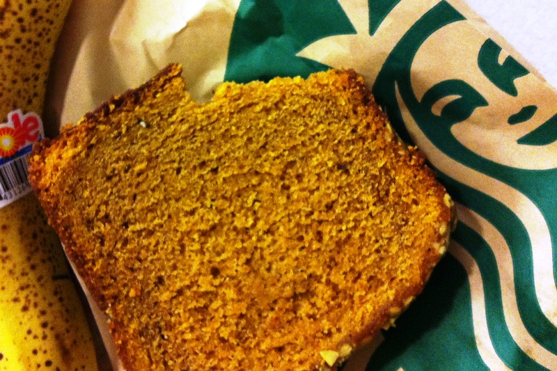 Posted on April 26, 2012 by WillemWednesday/ a Starbucks breakfast Wednesday morning had me in the office early to prepare some lessons for the day’s training. The slice of pumpkin bread from you-know-who (Starbucks) and a banana was breakfast.