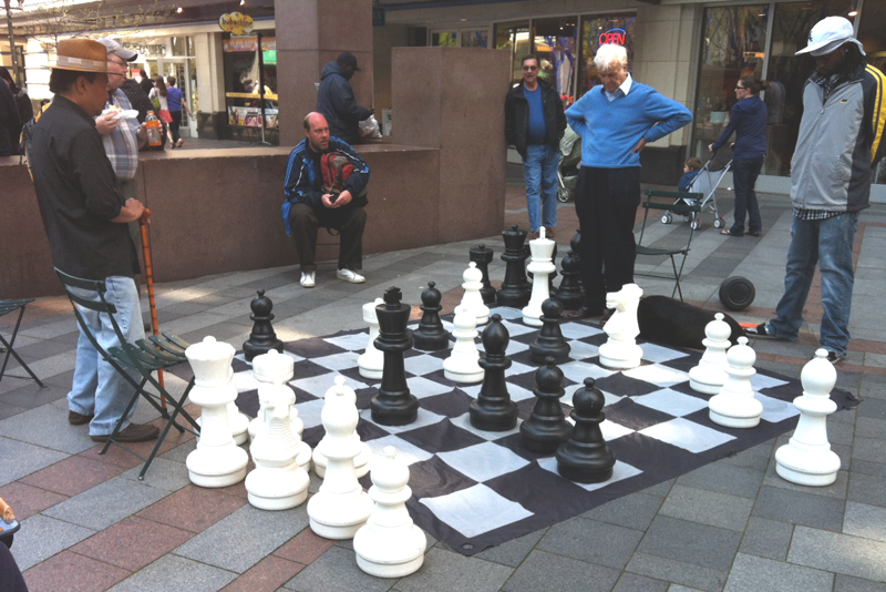 I found these very very blue trees today in downtown Seattle, across from Westlake Center. The blue was applied by Australian artist Konstantin Dimopoulos and is a mixture of powdered azurite (a vibrant blue copper mineral rock) and water. The big chess game took place close by.