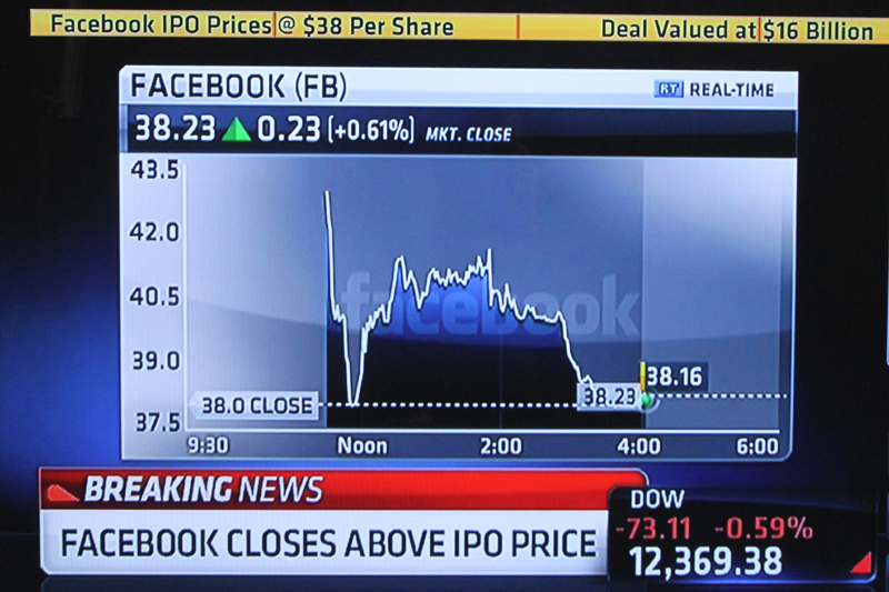 Alright, I confess : I watched CNBC-That-Wall-Street-Cheerleader-Channel for coverage of the Facebook open and for the close. The close turned out to be more exciting than the open. It would have been bad if the stock price had not stayed above its initial offering price of $38 on its very first day .. but then again, that $38 share price is stratospherically expensive.