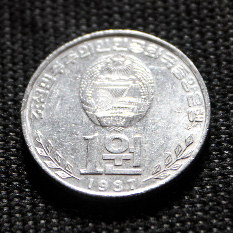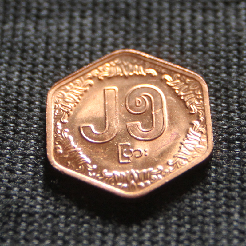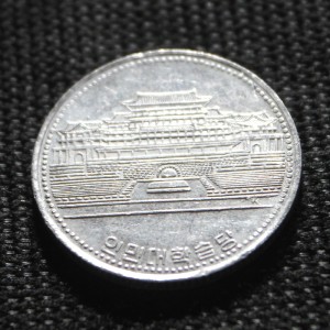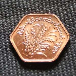 The collection of ‘World Coins’ contains the smallest coins from 50 countries, but NO penny from the United States in the collection, and NO one cent from South Africa! Hmm. And that 1 Yuan coin from China actually comes in 1/10 Yuan coins as well.Here is a 1 won coin from North Korea. Its diameter is larger than a US quarter (24.26 mm) at 27 mm, but it is made of aluminum, so much much lighter than a quarter (2.32 g compared to 5.670 g). Enlarge the picture to see the tiny characters on the banner at the bottom of the coat-of-arms.This is the back of the 1 won North Korean coin, depicting the Grand People’s Study House is the central library located in the North Korean capital, Pyongyang. (I am sure that the contents of the library content is strictly controlled !).This hexagonal coin is from Myanmar and worth 25 pya (hard to say how many US pennies’ worth. I couldn’t find Myanmar currency on any of the online converters!). The coin is made of copper-plated steel and weighs 5g, so slightly less than a quarter.And – know what this is on the back of the Myanmar coin? Why, it’s easy : it’s a rice plant! (Ok, I will ‘fess up – I didn’t know that, I had to look it up).