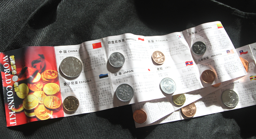 Check these out! I bought this set of used coins on the Minsk aircraft carrier museum (see my post of Sunday July 1) for ¥120 (about US$20). The collection contains the smallest coins from some 50 countries. Notably absent, though : the venerable one penny from the United States, and the one cent from South Africa! Hmm. The set DOES contain coins from some very unusual countries : North Korea and Myanmar, for example.