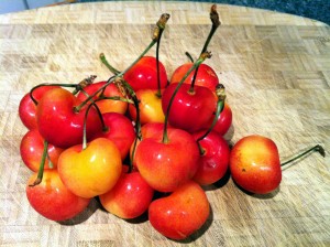 It’s Rainier cherry season and I got some even though they are pretty darn expensive. The cherries were cultivated back in 1952 in Washington State. They are very sensitive to temperature, wind, and rain. About a third of a Rainier cherry orchard’s crop is eaten by birds.