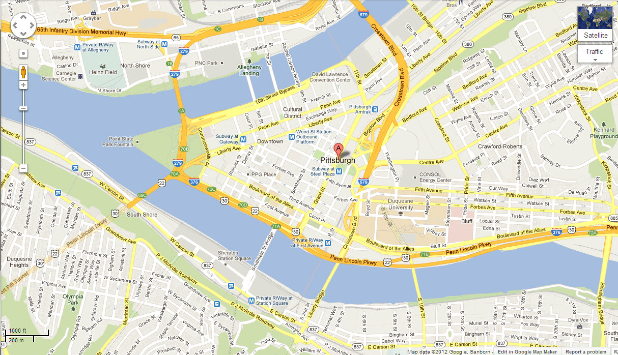 Downtown Pittsburgh is at the confluence of the Allegheny and Monongahela rivers, which form the Ohio River.