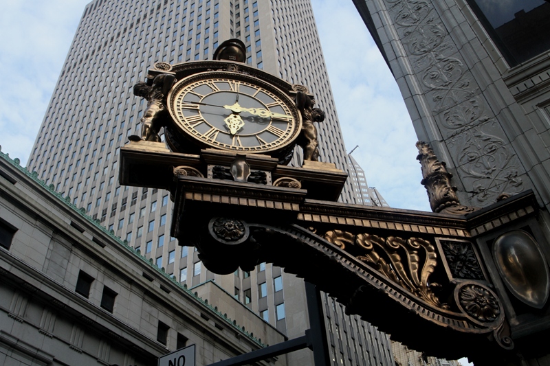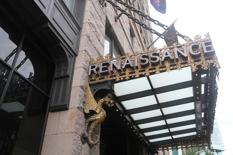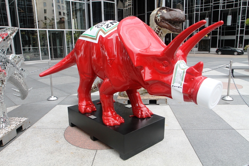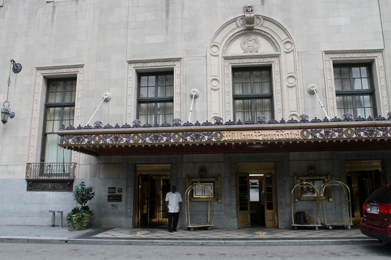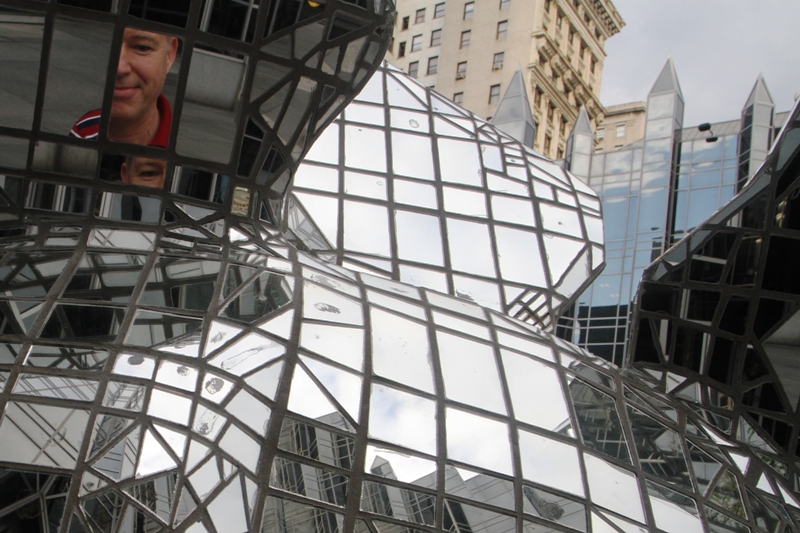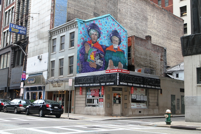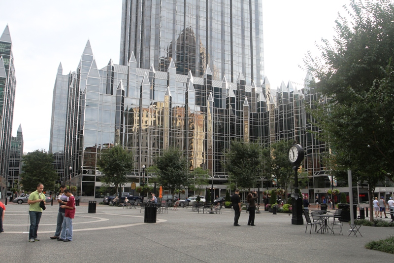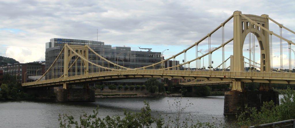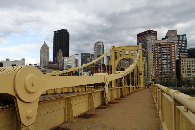I don’t have the names of these buildings! I just loved the contrast of the old architecture (not sure what style this is .. Baroque?) brushing up against the sleek modern stone and steel building.I will go and stay in the William Penn hotel just to be able to admire the canopy while I wait for my taxi to take me to the airport. (I stayed at the Marriott a few blocks away).Check out the detail of the metal work on the canopy. Out of this world.Colorful mural painting on an exposed brick wall.Here I am on the Andy Warhol Bridge, also known as the Seventh Street Bridge looking at the city’s skyline. The bridge spans the Allegheny River. I am surrounded by the bridge’s custard color!And this is the Rachel Carson Bridge, also known as the Ninth Street Bridge.Canopy of the Renaissance Center in the cultural district.Here’s a Heinz ketchup triceratops in the square at PNC World Headquarters : a tribute to Heinz Company that has had its headquarters in Pittsburgh for more than a century now.There was also a mosaic mirror tile Stegosaurus.Beautiful ironwork detail on a gate in a building downtown.This ornate clock dates from 1898 and is on the corner of the Macy’s department store, declared a national landmark.The First Presbyterian Church in downtown Pittsburgh. Reminds one a little of Notre Dame, does it not?A skateboarder came riding into my picture of the old downtown and its tall buildings. This is Fifth Ave.Here’s where the triceratops and stegosaurus are. No, it’s not a Mormon temple! It’s the plaza inside the PNC Bank’s world headquarter buildings.