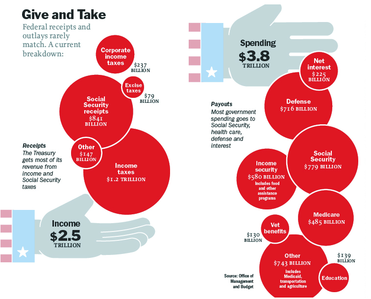 The ‘Briefing’ page from TIME magazine’s latest edition.And here is a diagram published by TIME magazine’s Sept 17, 2012 edition. Looks to me as if the Corporate Income taxes ‘coin’ could be bigger, as does the Income Taxes one (just because there are no other big Receipts), and then on the Payments side, Defense could be smaller. There is an on-going and bitter political debate about Income Security, Medicare and ‘Other’ payments.