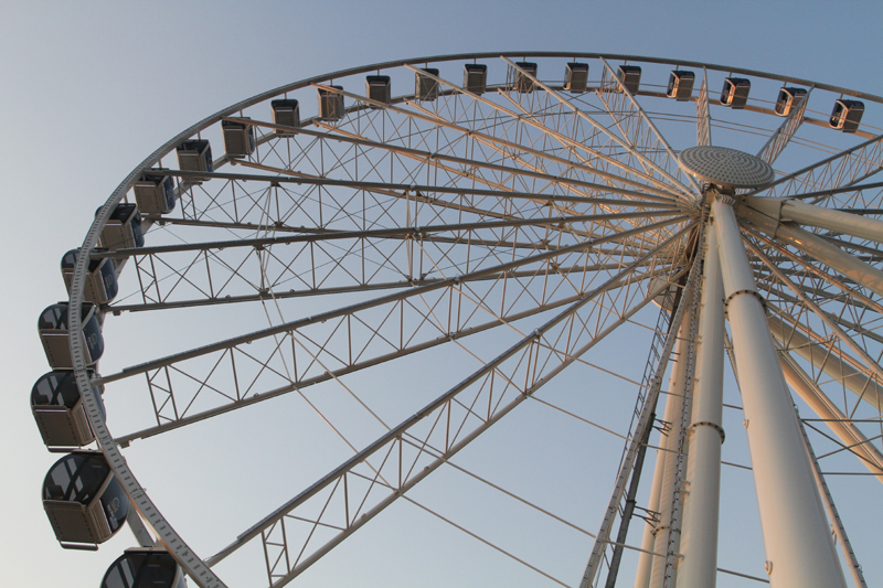 The Seattle Great Wheel is 175 ft (53.3m) tall and has 42 enclosed climate-controlled gondolas for a year-round operation. The London Eye is a lot bigger at a height of 443 ft (135 m).I am standing below the Wheel on the pier. There doesn’t seem to be a gear track on the big wheel meshing with a pinion gear on the ground structure. Check out the sturdy black roller that is in contact with the wheel frame (to the left of the upper gondola).The sun is setting on Elliott Bay and Pier 57, but no matter, the Wheel keeps going and will actually be lit up in different colors at night time. I will catch it another time for some night time pictures as well.
