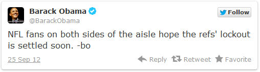 It’s the Green Bay Packers 12, Seattle Seahawks 7. It’s the final play in the 4th quarter. Seahawks rookie quarterback Russell Wilson pass deep left to Golden Tate (blue #81 shirt) for 24 yards. It is ruled as a TOUCHDOWN (check out the animated picture from SB Nation). The replay assistant challenged the pass completion ruling, but the play was — upheld. Place kicker Hauschka adds a point. Seattle wins 14-12. There’s more : the regular NFL referees are still ‘locked out’ due to a contract dispute, so the replacement refs had to do the best they can. Today (Tuesday) the NFL admits an error was made but upheld the outcome of the game. Even President Obama weighed in on Twitter (see below). So we will see if the contract dispute with the referees get resolved soon. My view : the NFL is awash in cash. What is so hard about it?