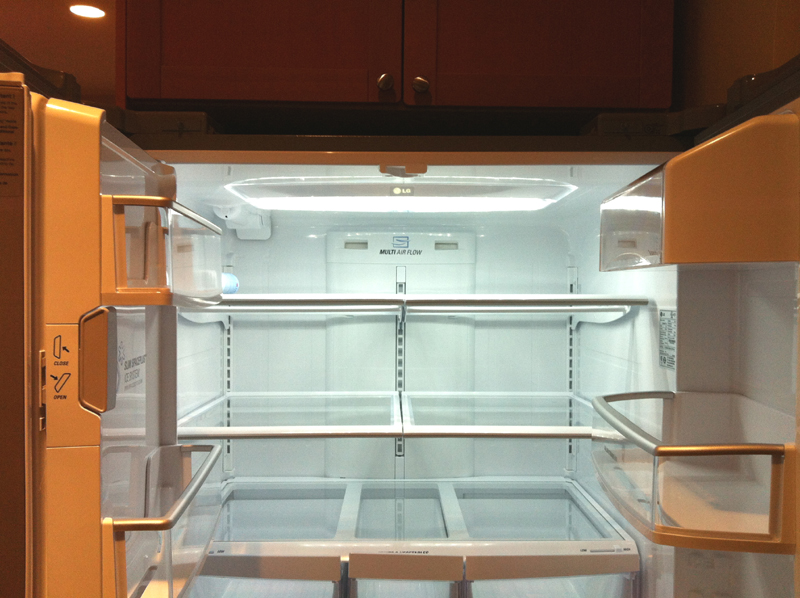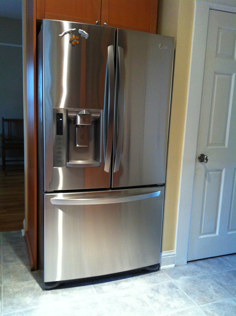 My new refrigerator arrived early Wednesday morning. The Sears delivery truck blocked the entire street in front of my house. Oh well. And the monster made it through the front door, but only with a special trick : sideways and tilted with the top doors completely open. The door handles are very stylish and nice to use but they stick out a few inches. And there it is .. what is this gleaming thing? I still think for a split second when walking into my kitchen. Oh, it’s your new fridge, silly. And I am so thrilled to close the fridge door and know it is frrosty inside!