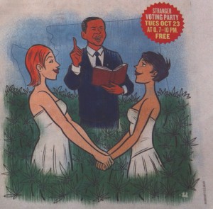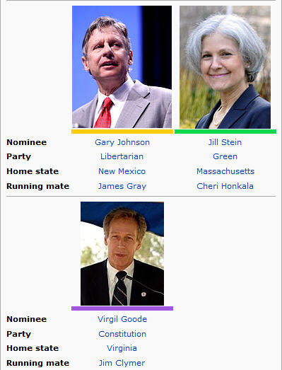 Picture from the election issue of the alternate Seattle newspaper The Stranger. The newspaper fully endorses our tongue-in-cheek ‘Kenyan Muslim overlord President’. I suppose that is him they are depicting, marrying two women in a field of marijuana.[From Wikipedia] The two heavyweight contenders for President in 2012 ..[From Wikipedia] .. but these two other candidates have ballot access sufficient to also theoretically win the election by a majority of the electoral college: former New Mexico Governor Gary Johnson, the Libertarian nominee; and Jill Stein, the Green Party nominee. Virgil Goode will no doubt draw some Tea Party votes away from Mitt Romney in the swing state of Virginia : bad news for the Republicans.A full blown article in The Stranger pleads with its readers to NOT vote for ‘moderate’ Republican Rob McKenna for Governor. ‘If is looks like an elephant and walks like an elephant, then it IS an elephant’. (The elephant is the mascot of the Republican Party).